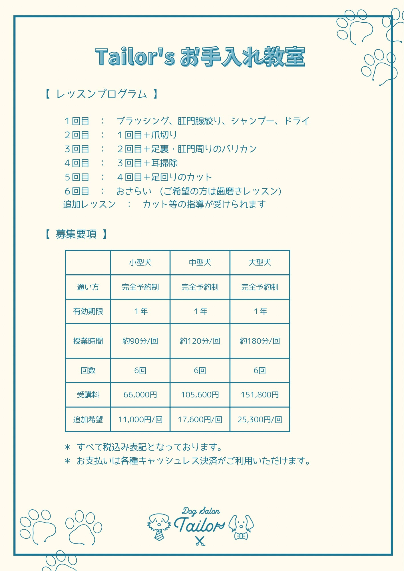 *ご愛犬を飼い主様がご自宅でお手入れできるようになることが目的のレッスンですので、必ず飼い主様がご受講ください。一時的にお預かりしているワンコでの受講はお断りさせていただいております。
